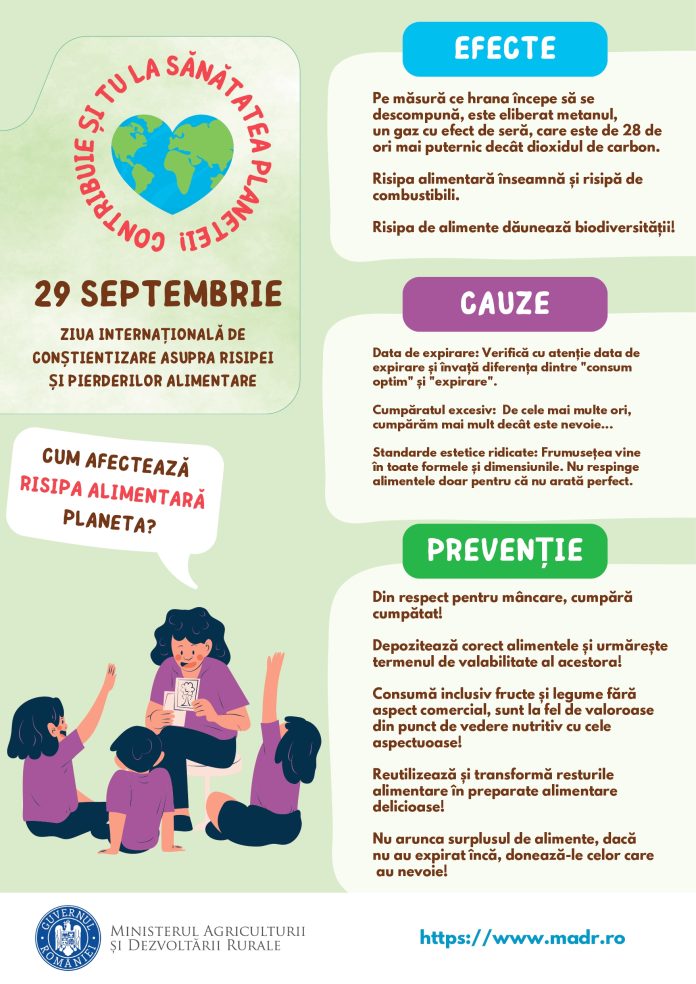 Ministerul Agriculturii și Dezvoltării Rurale continuă campania de informare și conștientizare asupra efectelor majore și pe termen lung ale risipei de alimente Și tu poți proteja planeta! Împreună dăm startul la reducerea risipei de alimente”, cu ocazia Zilei Internaționale de Conștientizare asupra Risipei și Pierderilor Alimentare, marcată anual la data de 29 septembrie.