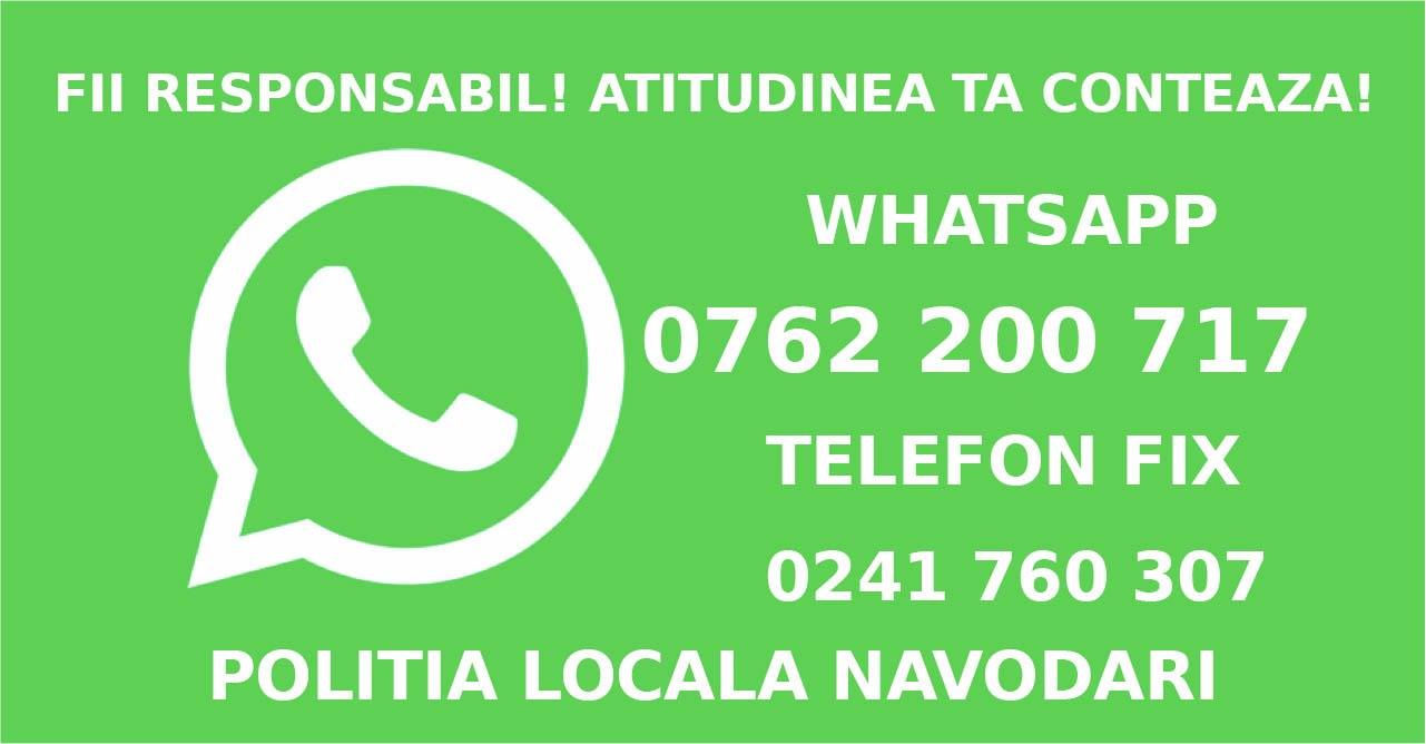 Cetățenii care constată fapte anti-sociale sau au nevoie de intervenția unui echipaj al poliției locale, pot apela la nr. de tel. 0241.760.307 sau pe whatsapp la nr. 0762.200.717.